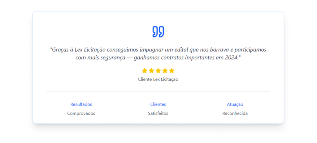 A Lex Licitação atua desde 2012, apoiando empresas de todo o Brasil com assessoria técnica em licitações públicas. Somos uma equipe remota, ágil e especializada, trabalhamos como extensão da sua empresa para simplificar, acelerar e dar segurança à sua participação em processos de contratação pública.